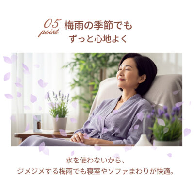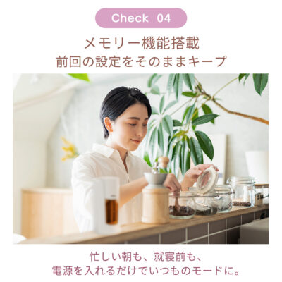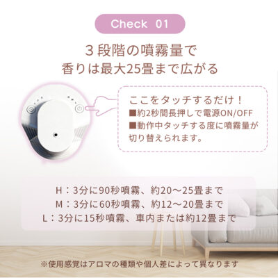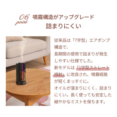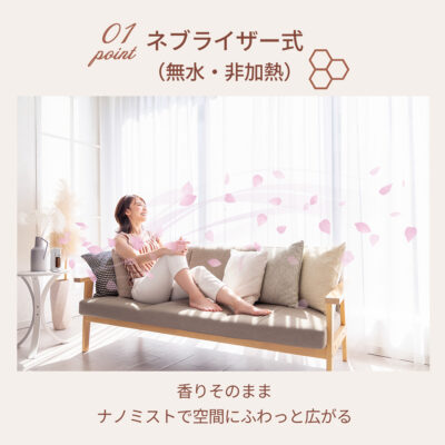 ・【水・熱を使わないネブライザー式】精油をナノミスト化し、加熱せずそのまま噴霧します。水を使わないためカビや雑菌の繁殖リスクが少なく衛生的で、お手入れも簡単。梅雨の時期でも湿気を気にせず快適に使用でき、精油本来の濃厚な香りが瞬時に空間へ広がります。
