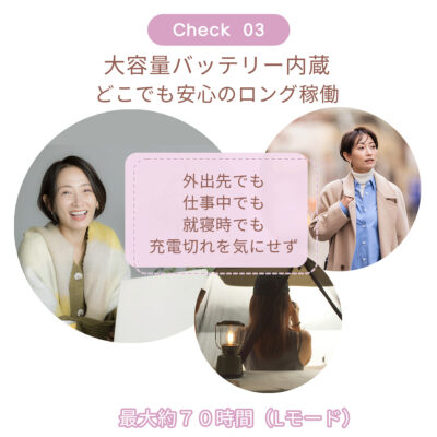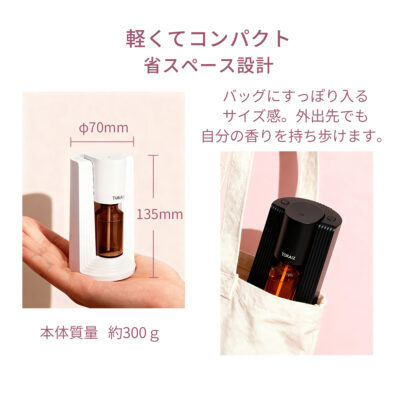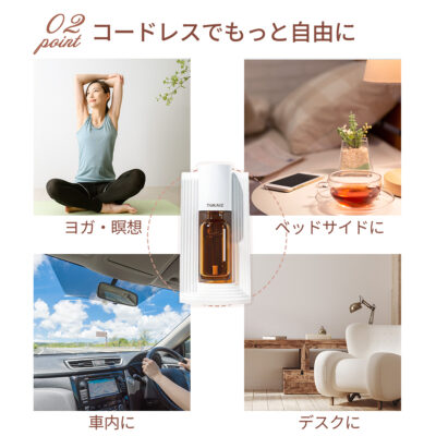 ・【コードレスで最大75時間稼働】2000mAhの大容量バッテリーを内蔵し、約4時間の満充電で最大75時間(Lモード時)のコードレス使用が可能です。寝室、リビング、オフィスはもちろん、車内など電源のない場所でも自由に持ち運んで香りを楽しめます。