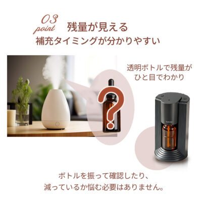 ・【残量が見える&ボトル直結】本体のスリットからオイルの残量が一目で確認できるため、補充のタイミングが分かりやすく、空焚きを防止できます。付属の20ml瓶や、市販の10ml/20mlの精油瓶を直接ノズルに取り付けて使用できるため、面倒な水汲みや頻繁なオイル補充の手間がありません。