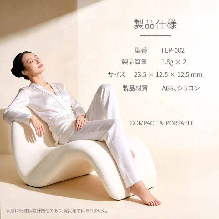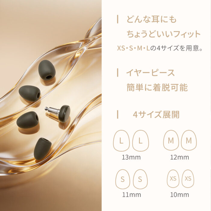 | 商品仕様 | 本体サイズ:約23.5mm×12.5mm×12.5mm 本体重量:1.8g×2 イヤーチップサイズ:XS/S/M/L 材質:ABS、シリコン |