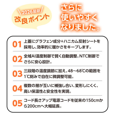 ・【5面加熱構造】左右・前面・底面に加え、上部カバー付き設計で熱を逃さず、足元全体を効率的に暖めます。反射シート採用で保温性強化。