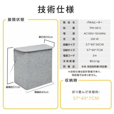 商品仕様 | 電源:AC100V~50/60Hz 定格:200W 展開サイズ:約57×40×30cm 収納サイズ:約57×40×7cm 電源コード:約2m 本体重量:約2.6kg |