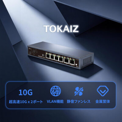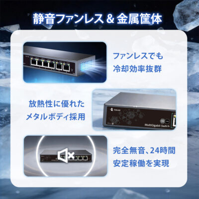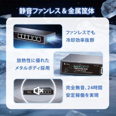 主な機能:VLANモード/標準モード切替、ファンレス静音設計