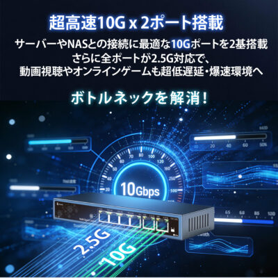 ・【超高速10G×2基搭載】10Gアップリンクポートを2基搭載。サーバーやNAS接続のボトルネックを解消します。